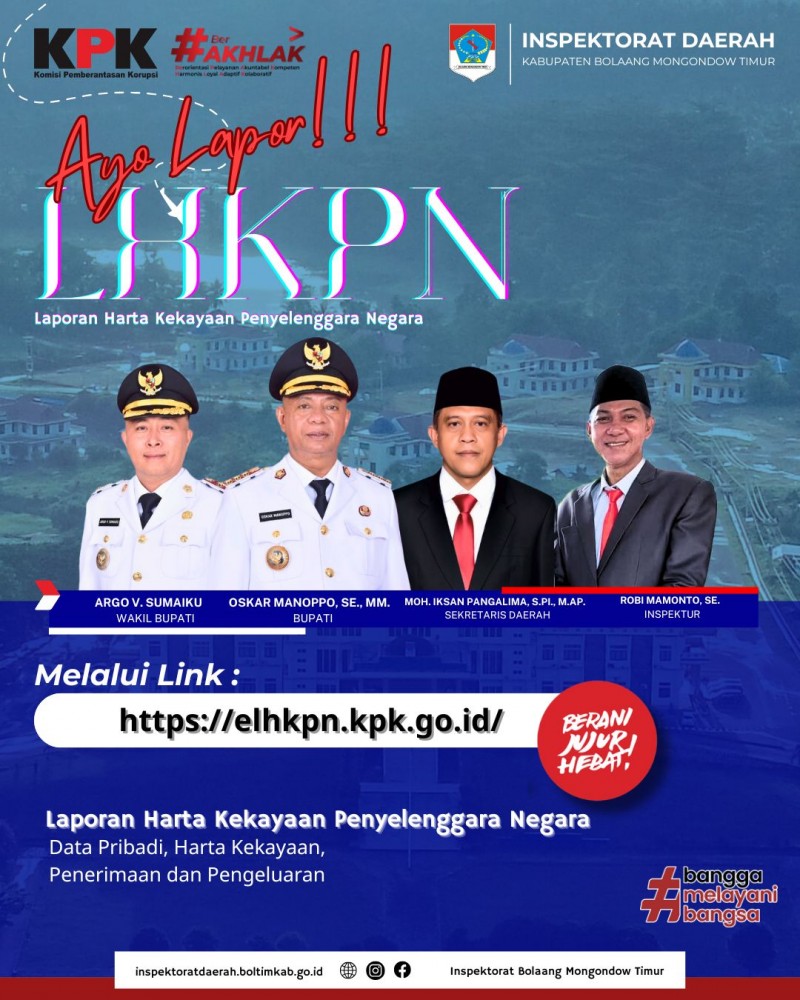 Silahkan Klik pada tautan tersebut untuk melaporkan Gratifikasi yang terjadi di Lingkungan Pemerintah Daerah Kabupaten Bolaang Mongondow Timur. Kami menjamin penuh kerahasiaan data dan privasi anda sebagai pelapor. Kl… selengkapnya